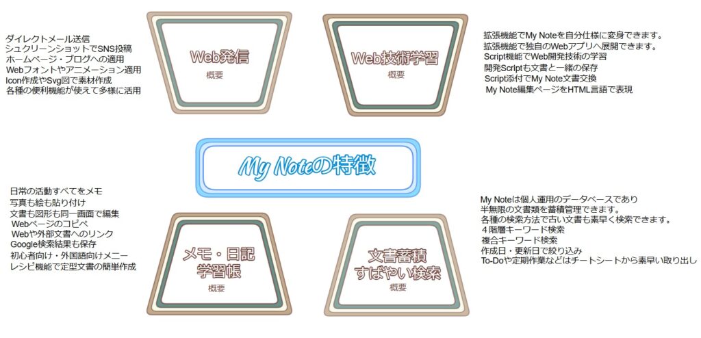 My Noteは言語は使わないが出来上がりは図形(Svg言語)と文章(Html言語)を融合させた文書を構成する言語レスなエディターです。My Noteで作成した文書(各ページ)はデーターベース内のデータとして管理され半無限の文書を保存できると同時にキーワード検索で即座に目的の文書を取り出すことが出来ます。ローカルPC上で運用するEvernoteのようなものです。また、スクリプト機能(Javascript言語)を使えますのでMy Noteの中に独自の付加機能を加えることが可能なので必要な機能を付け加えて自分仕様のMy Noteに変身させることが出来ます。今回の改定ではWeb発信やWebでの適用の機能を充実させました。特に下記に付加しているテーブル目次の「便利な機能」部分を御覧頂きMy Noteで編集できる文書の例として評価してみて下さい。特にWeb技術を教えている先生方やWeb技術を学んでいる方々に評価頂いて足りない部分をご指摘頂ければありがたいのです。まずはフル機能が利用可能な無償のデモ版で試してみて下さい。販売する有料版は僅か米7$ですべての機能が入手できます。