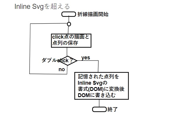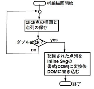 左の図が折れ線を描画しつつ点列を記憶し、最後にDOM形式に変換して保存するアルゴリズムです。DOM形式に変換すると書いていますがInline Svgの形の文字列を生成し、それをSvgタグ中にDOM要素として書き込むことでSvgタグが呼ばれる度に再描画されることになります。